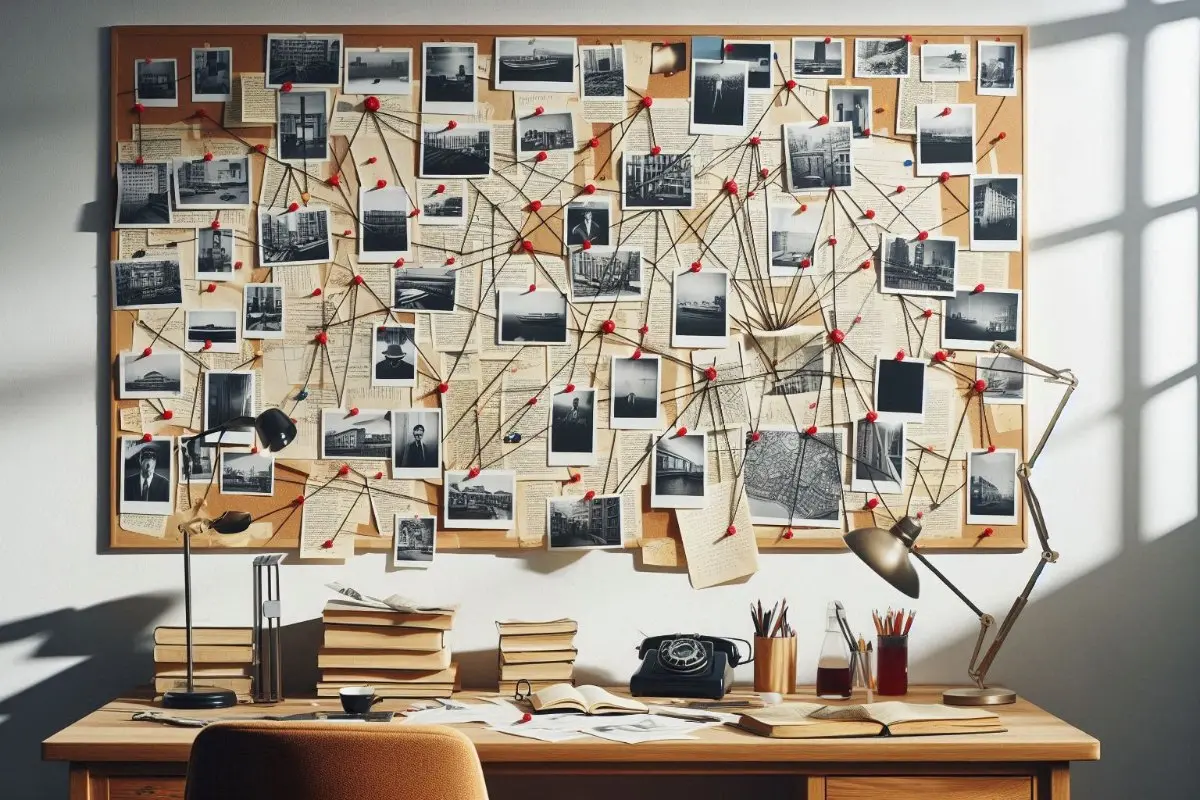 1. Abundan los mapas mentales, ordenados en retícula, aunque también los hay lineales. Una vez atrapados en el lugar común, algunos directores cambiarán los dispositivos y la pizarra le da lugar a la pared de la oficina, el comedor de la casa o la covacha; gises o plumones pueden ser desplazados por hilos y tachuelas o pinzas de tendedero para vincular los nodos en los que lo mismo hay fotografías –con frecuencia de antiguas polaroid–, reliquias, recortes de prensa, páginas de un diario, resúmenes de algún análisis de ADN; papelitos engomados, que se van eliminando por otros nodos con su nota conforme avanza la investigación, aunque a veces, los primeros en eliminarse reaparecen y por lo regular corresponden al culpable o la red criminal implicada.