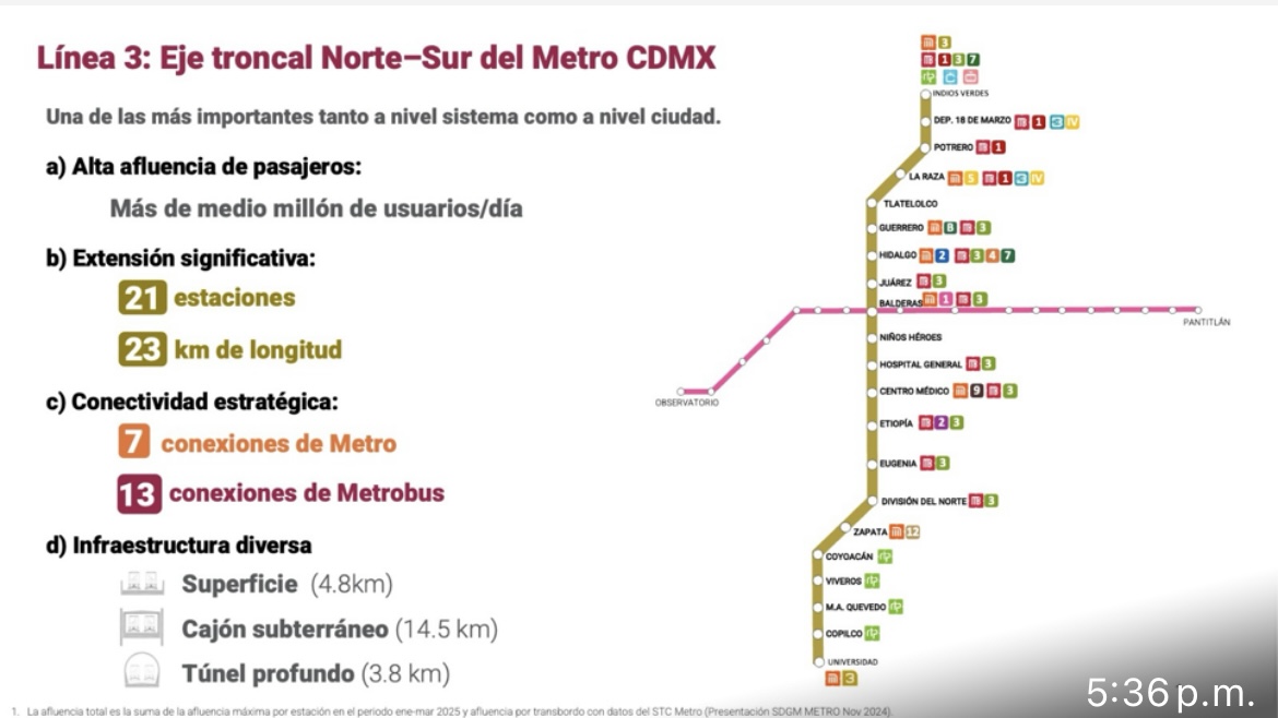 El secretario de Movilidad, Héctor Ulises García Nieto, comentó que la renovación de la Línea 3 es un tema ya urgente porque la infraestructura, lo que tiene que ver con vía electromecánica y la obra civil, requiere una rehabilitación por el desgaste acumulado.