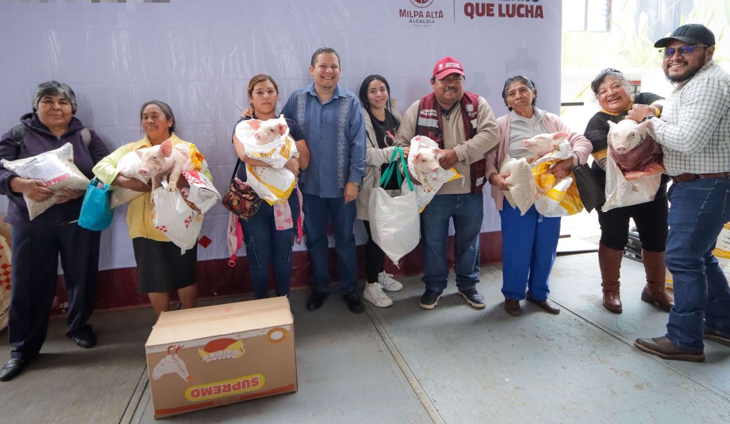 Octavio Rivero Villaseñor, Alcalde de Mila Alta, en apoyo a productoras del campo de su región, entregó paquetes de animales de traspatió, con el fin de apoyar la economía familiar.