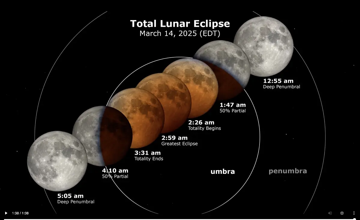 Descarga el video con el diagrama del eclipse y el mapa que muestra dónde será visible el eclipse lunar del 13 al 14 de marzo de 2025 aquí.