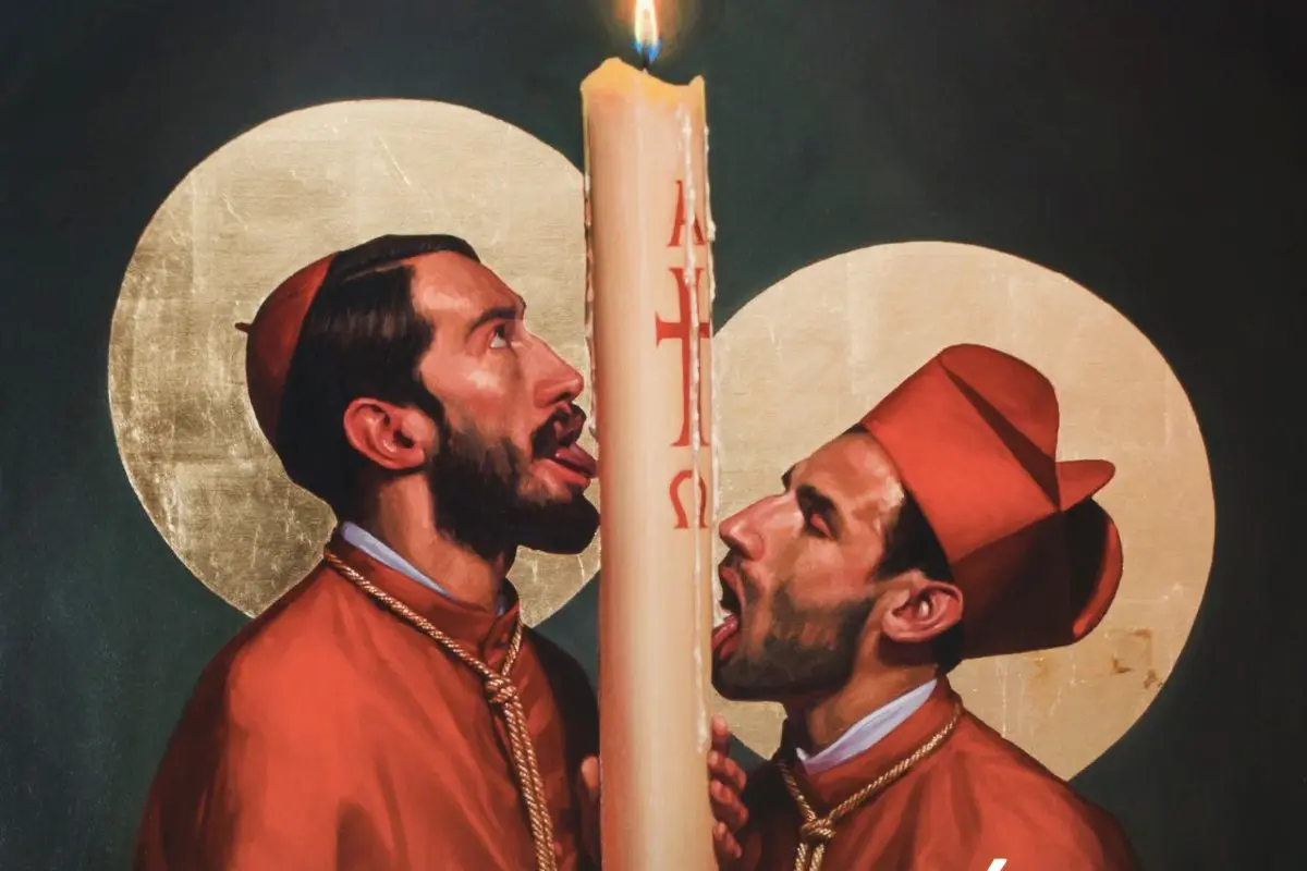 La propuesta de Chairez incluye piezas en donde figuras que evocan a símbolos de la iglesia católica aparecen en posiciones eróticas con elementos sacros.